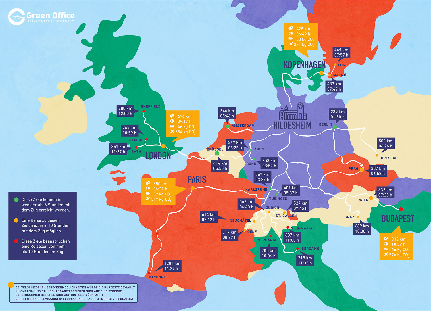 Infografik einer Bahnreisekarte, als Inspiration für klimafreundliches Reisen von Hildesheim in beliebte Dienstreise-Ziele und Austauschorte der Uni Hildesheim. Weitere Infos gibt es beim