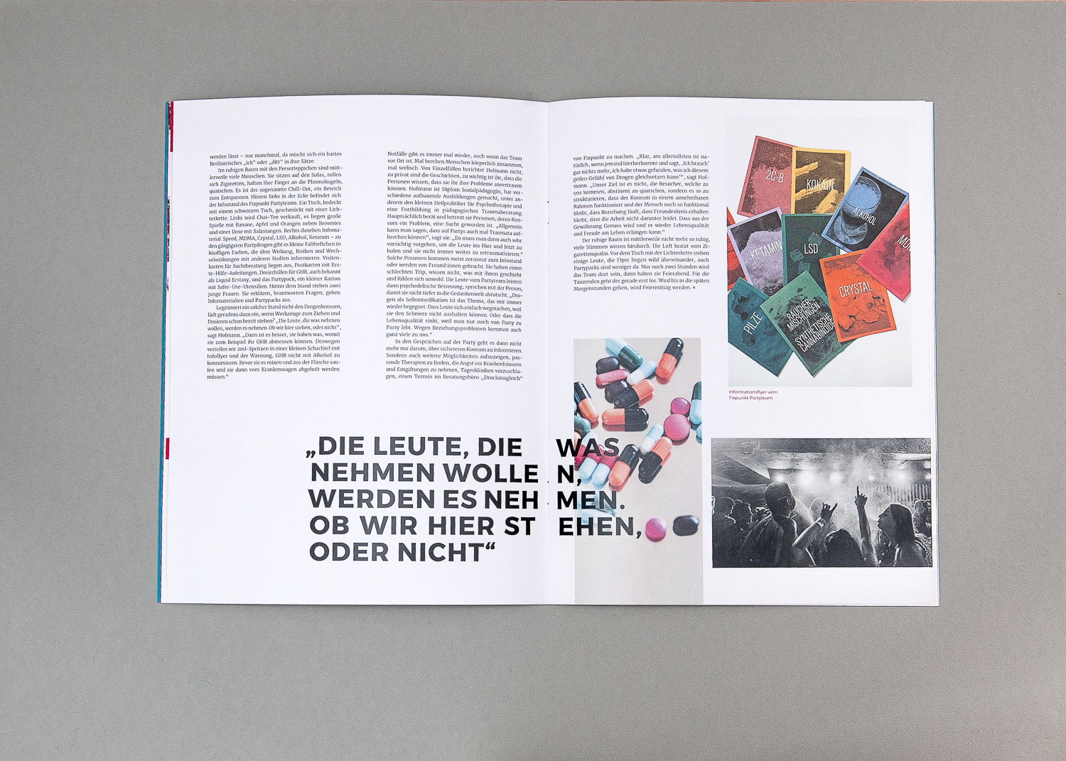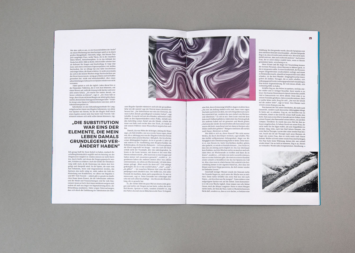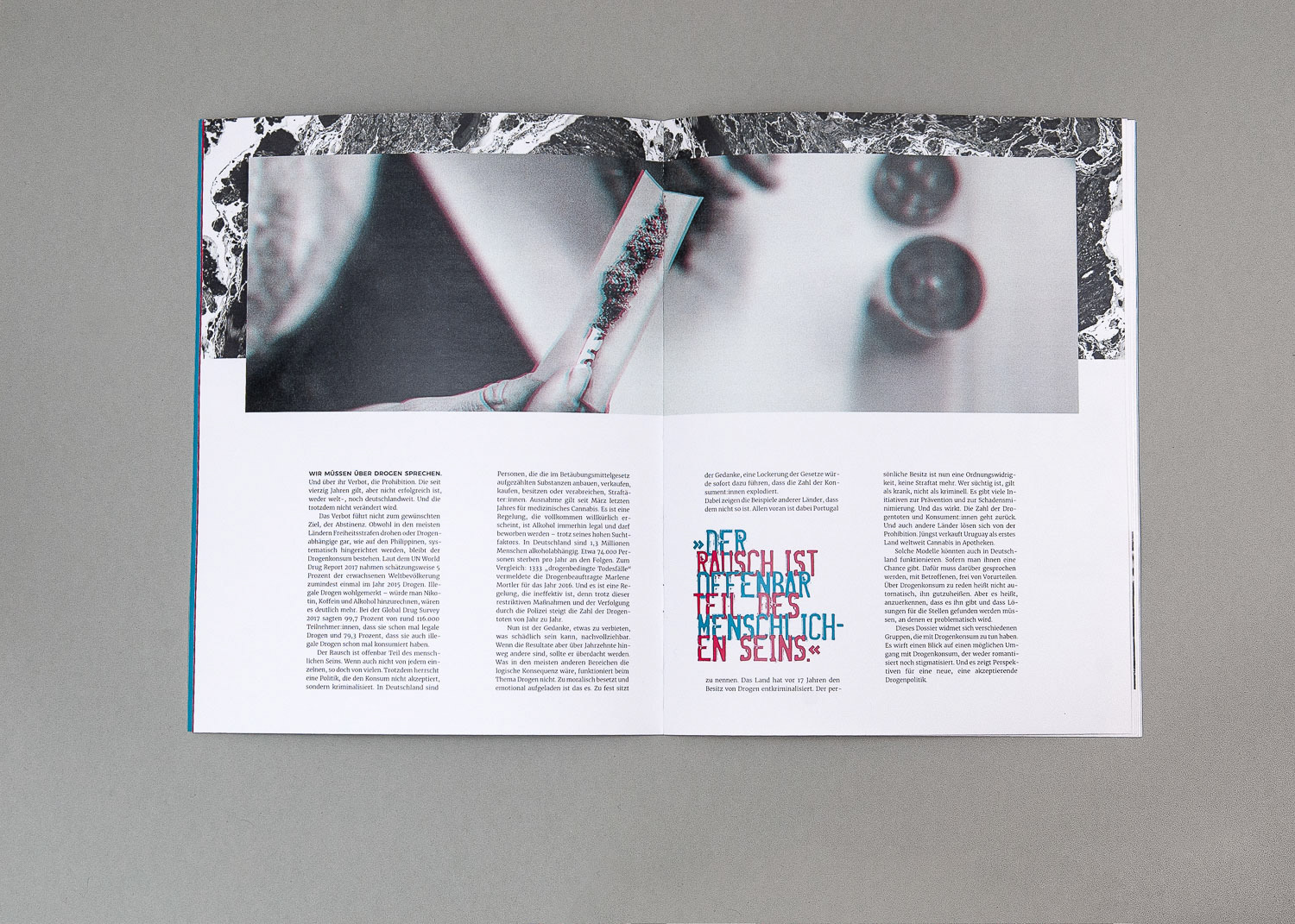 Editorial-Design für die Masterarbeit „Neues Probieren – Ein Dossier zur Akzeptanz der Substanz“ im Bereich Kulturjournalismus.