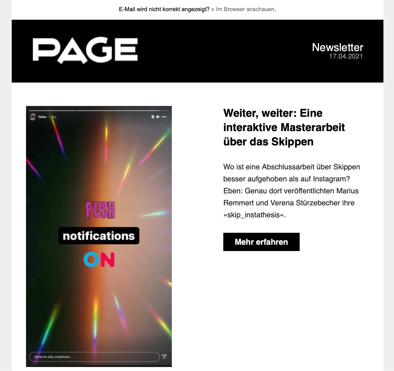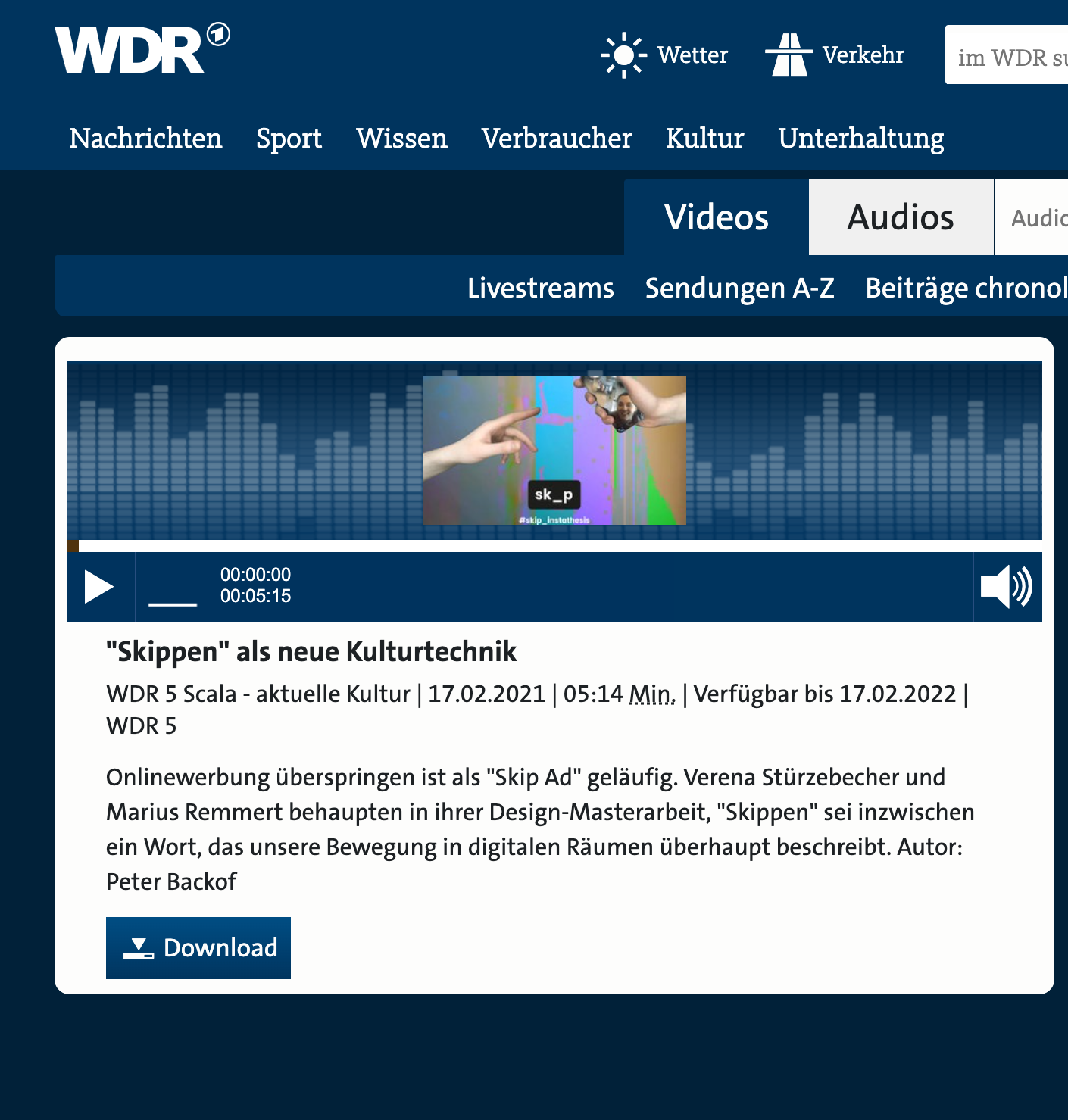 Wir alle kennen es, denn wir machen es täglich: Wir „skippen“. Sei es das Kapitel im Buch, das Intro der Lieblingsserie oder die Werbung auf YouTube. Aber was bedeutet es, innerhalb eines Wimpernschlags auf bestimmte Inhalte zu verzichten? Diese und weitere Fragen werden in einer neuen wissenschaftlichen Vermittlungsform auf Instagram unter „skip_instathesis” behandelt.